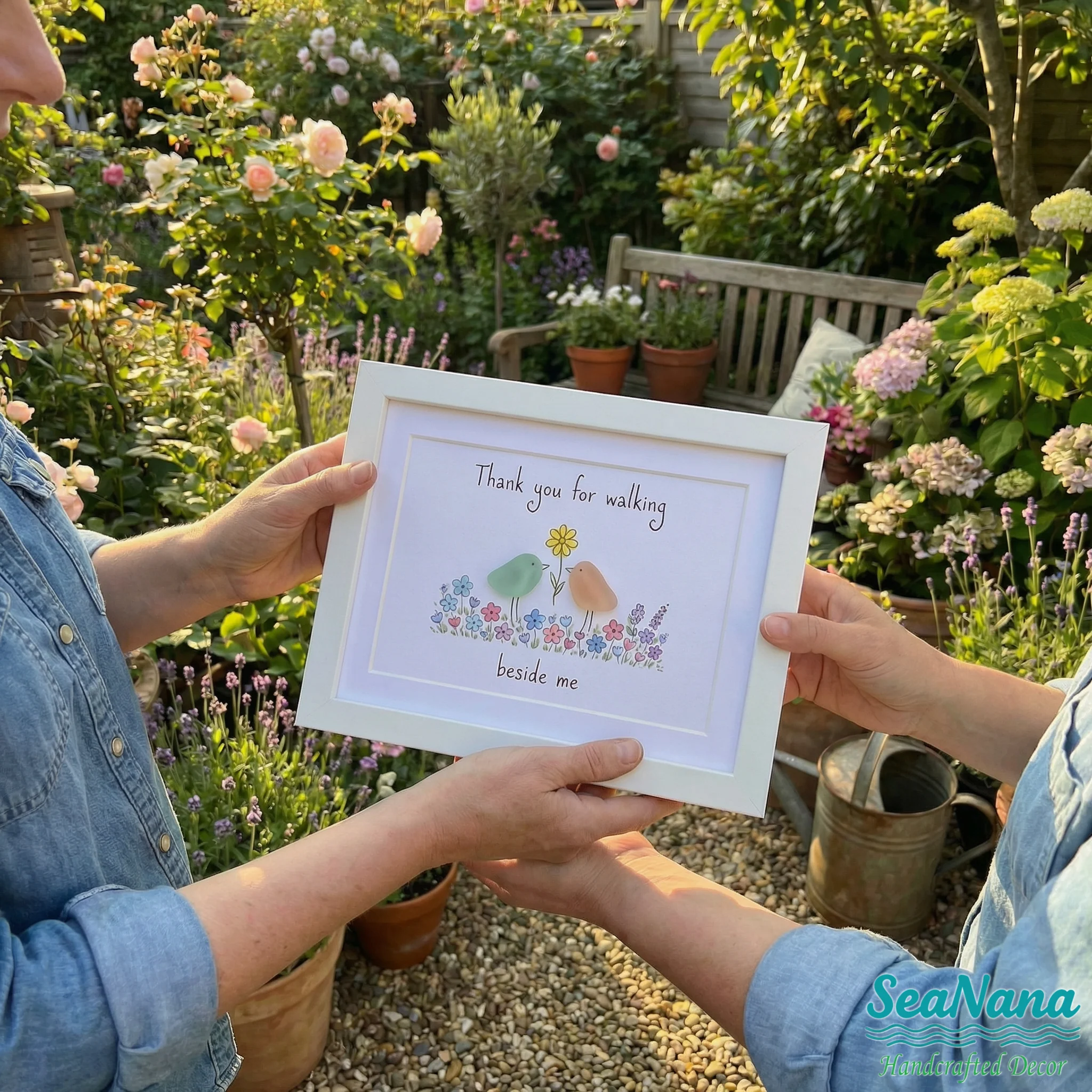 Each exquisite piece is a miniature garden of affection, featuring two charming sea glass birds amidst delicate hand-drawn flowers. These unique scenes are thoughtfully composed around heartwarming messages, capturing the essence of true companionship. Crafted by hand using authentic, ocean-tumbled sea glass and set within a pristine white frame, they are a beautiful blend of coastal charm and heartfelt sentiment.